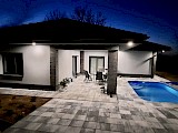 Druhý dům má dispozici 1KK o výměře 45 m2, který je vhodný pro návštěvy, nebo rodinu. Velkou výhodou obou domů je energetická soběstačnost celkem 95%, fotovoltajické panely s baterkami jako zdroj elektrické energie. Oba domy mají podlahové vytápění s termostatem, předpokládané náklady domu jsou 500,-Kč/měsíčně. V domech jsou plně vybavené kuchyňské linky se spotřebiči, koupelna s moderním sprchovým koutem v každém domě je italská mramorová dlažba a obklady, skleněné dveře, plastová trojskla HS Portal, klimatizace vše v nadstandardní výbavě. Dům je zhotovený z ytongu 45 cm + 10 cm zateplení, pod střechou je umístěn 60 vata, dům má velmi dobrou energetickou náročnost.